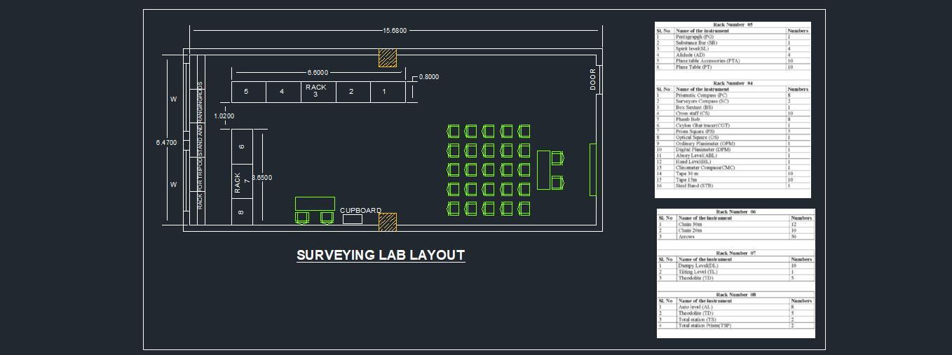 This course will help the students to know the basic principles of engineering surveying and measurements. This follows the effectively field procedures required for a professional surveyor. Use of techniques, skills and conventional surveying instruments necessary for engineering practice, this lab is well established with high end surveying instruments like, Total station, Theodolite, Auto level, along with necessary accessories. The total area of the lab is 100 sq. Meters