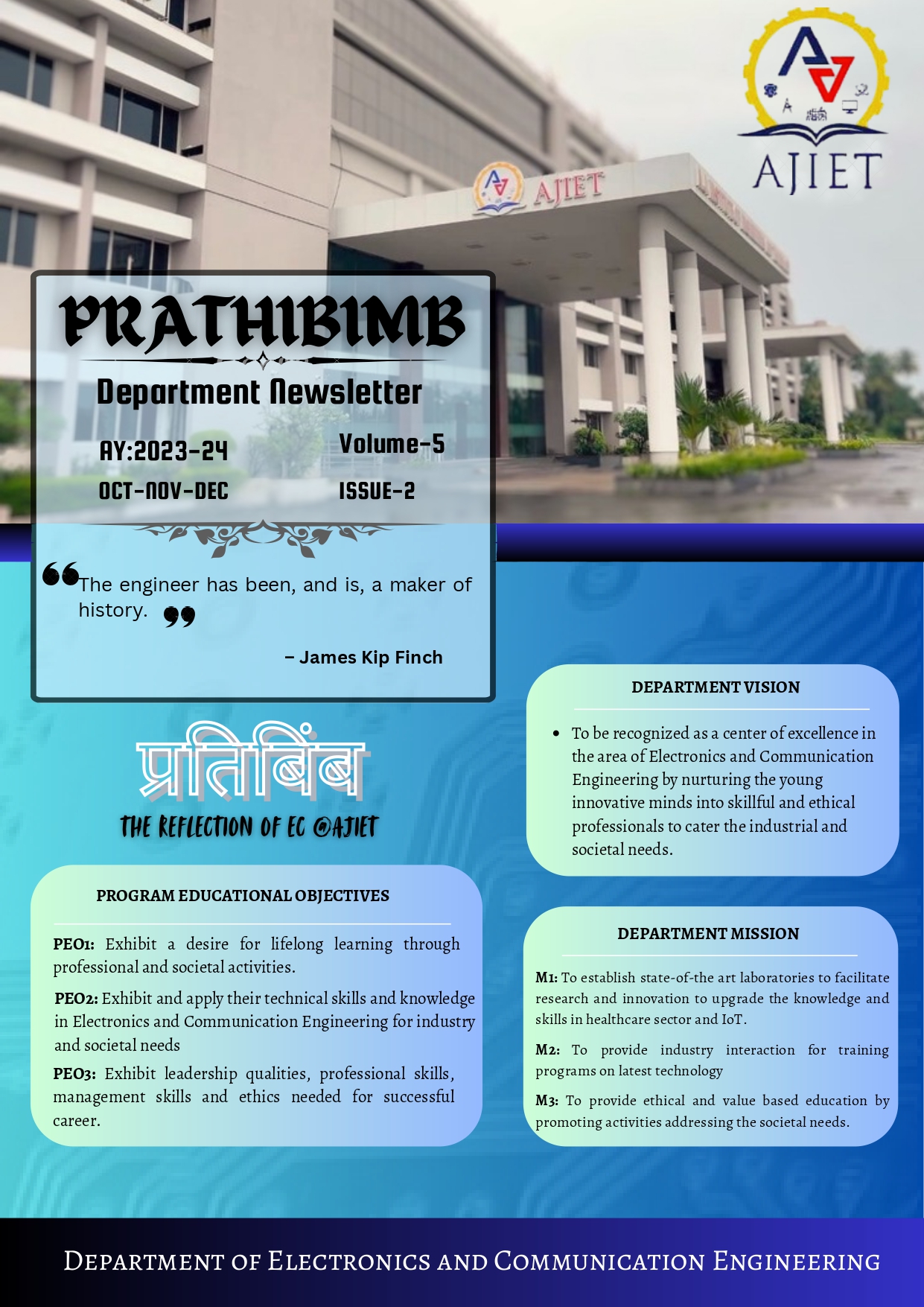 To be recognized as a center of excellence in the area of Electronics and Communication Engineering by nurturing the young innovative minds into skillful and ethical professionals to cater the industrial and societal needs