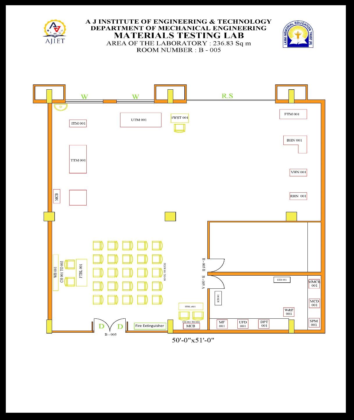 In Material Testing laboratory, the students will enrich their knowledge practically on various properties of Engineering materials. Students will be able to differentiate between Ferrous and Non- Ferrous materials, Cast Iron and steels, Metals and Alloys etc. They will have the knowledge of different properties such as Hardness, Toughness, Tensile strength, Compressive strength, Shear strength, Torsional and Bending strength and also failures such as Wear, internal cracks and so on. Students will be able to identify the usage of different laboratory testing equipment for particular purpose. Lab is provided with proper ventilation, space and sufficient lighting.