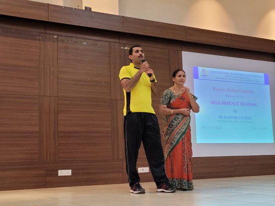 As a part of the Induction Program, The Women’s Welfare Committee of AJ Institute of Engineering Technology organized effective two hours of self-defence training for all first-year students on 12th November 2022 at 10.45 AM in seminar hall 3. The CEO and Founder of “Swaraksha for Women Trust®", Mangaluru, Mr.Karthik S Kateel, and his mother Mrs.Shobhalatha were the resource persons. The program was initiated with a welcome address and brief introduction about the resource persons by Dr.ShanthaKumari. K. The resource persons briefed the students on the basics of self-defence techniques, and guidelines about how to protect them from harassment. They demonstrated five techniques formulated by them on the basis of real incidents. Around 200 students benefited from these unique self-defence skills. Mrs.VishmithaShetty concluded the program by delivering a vote of thanks.