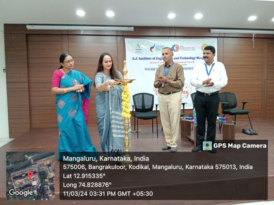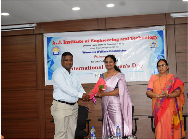 International women’s day 2023 : Women’s Day was celebrated in the AJIET on March 8, 2023, by holding an event in Seminar Hall 1. The event was organized by the Women's Welfare Committee (WWC), AJIET. The program started off by invoking God’s blessings with a meaningful prayer led by Ms. Panchami, a student of first-year ISE. The member of the Women’s Welfare Committee, Mrs. Divya, welcomed the gathering. The event was graced by Chief Guest Mrs. Komal Prabhu, Co-Proprietrix and COO of the Maharaja Group, Mangaluru. Mrs. Komal Prabhu narrated her childhood difficulties in her speech. She explained how her high school education is funded by giving tuition and babysitting and how she has grown her business after establishing Maharaja Family Restaurant in Mangalore in 2002. Now she is one of the best women entrepreneurs in the Mangalore region. She also advised girls to achieve higher education, the most powerful means of empowerment. The session was presided over by Principal, Dr. Shantharama Rai, who addressed the gathering and spoke on the Women’s Day theme "DigitALL: Innovation and technology for gender equality". Prizes were distributed to the winners of the essay writing and quiz competitions. Dr. Shantha Kumari K, Coordinator of Women's Welfare Committee, Principal Dr. Shantharama Rai, and Vice Principal Dr. Antony AJ felicitated the guest of honor. Ms. Keerthana, of first-year Computer Science and Engineering, proposed a vote of thanks. Ms.Risha Jesika Gonsalves, a student of 2nd year Information Science and Engineering, was the Master of Ceremony. The Women’s Day program was organized in the afternoon between 3.30 p.m. and 5p.m. The audience for the program was the women's teaching and non-teaching staff and all female students of AJIET, Mangaluru.