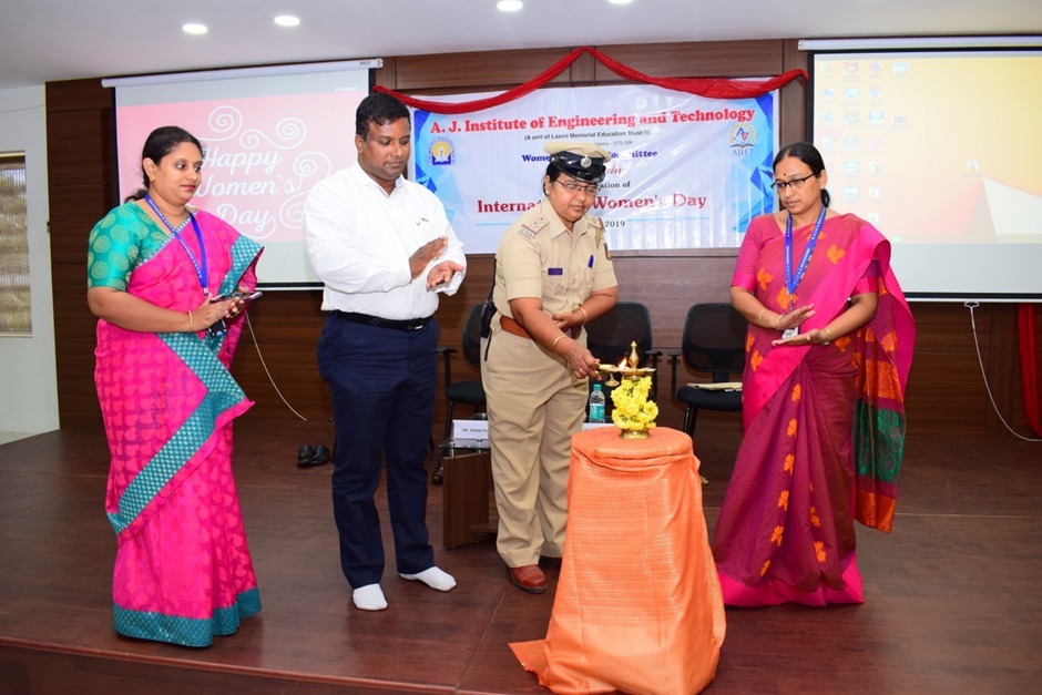 Women’s Day was celebrated in AJIET on 30th March, 2019 by holding an event in the seminar Hall -1. The event was organised by the Women's Welfare Committee (WWC), AJIET. The programme started off by invoking God’s blessings with a meaningful prayer led by Ms. Anajana, student of 4th Semester Civil. The Chairman of Women’s Welfare Committee, Dr. Shantha Kumari K. welcomed the gathering. The event was graced by Chief Guest Mrs. Malini Hasbhavi, Sub Inspector, Kavoor Police Station, Mangaluru. She said that women victims of sexual harassment, dowry harassment and domestic violence have to report to the Women’s desk which encourages women to speak openly and comfortably about sensitive issues. Session was presided by Principal, Dr. Shantharama Rai, who addressed the gathering and spoke on Women’s Day theme “Think Equal, Build Smart, Innovate for Change”. Dr. Sangeetha D M, Associate Professor, Dept. of Civil Engineering, proposed vote of thanks. Ms. Varsha Shetty, student of 6th Semester Computer Science Engineering was the Master of Ceremony.
